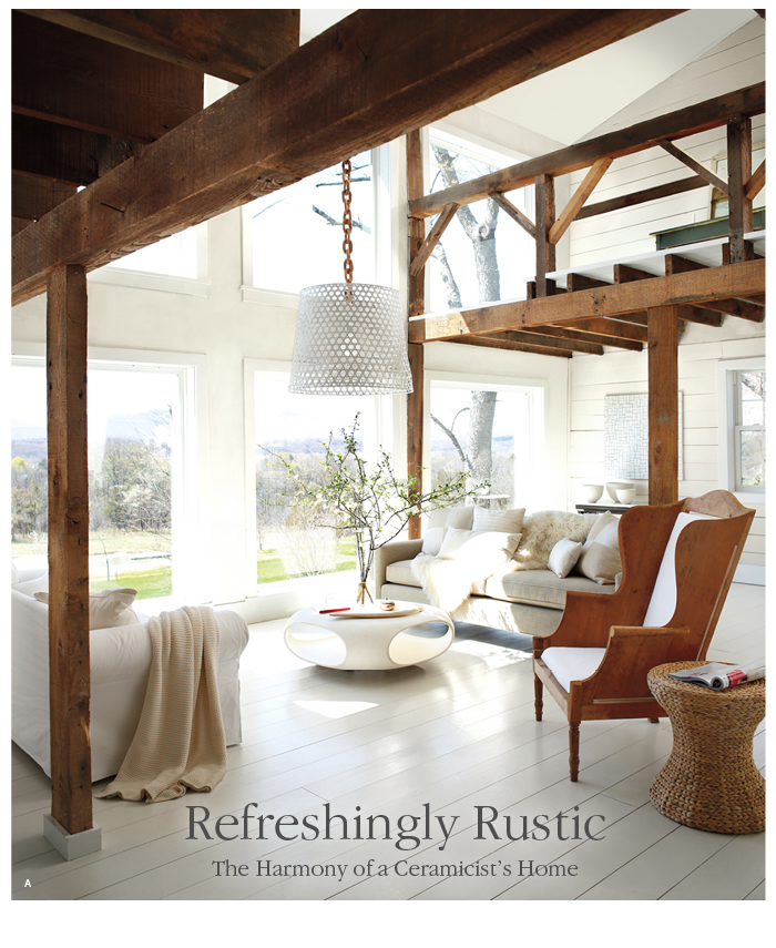 | Achieving the idyllic balance between modern style and rustic charm, texture is articulated through this home, complemented by an envelope of white. The warm hues inherent in wood make for beautiful neutral tones, both light and dark, enhancing this primarily white space. White-washed walls and hand-hewn beams provide a sense of strength and structure throughout, whilst coats of white paint refresh rustic boards. A play of sheen from the matte finish of the unglazed vases combined with the soft gloss Ice Mist (OC-67) trim give a softness and tactile quality that is both welcoming and comfortable in the ceramicist’s studio. |